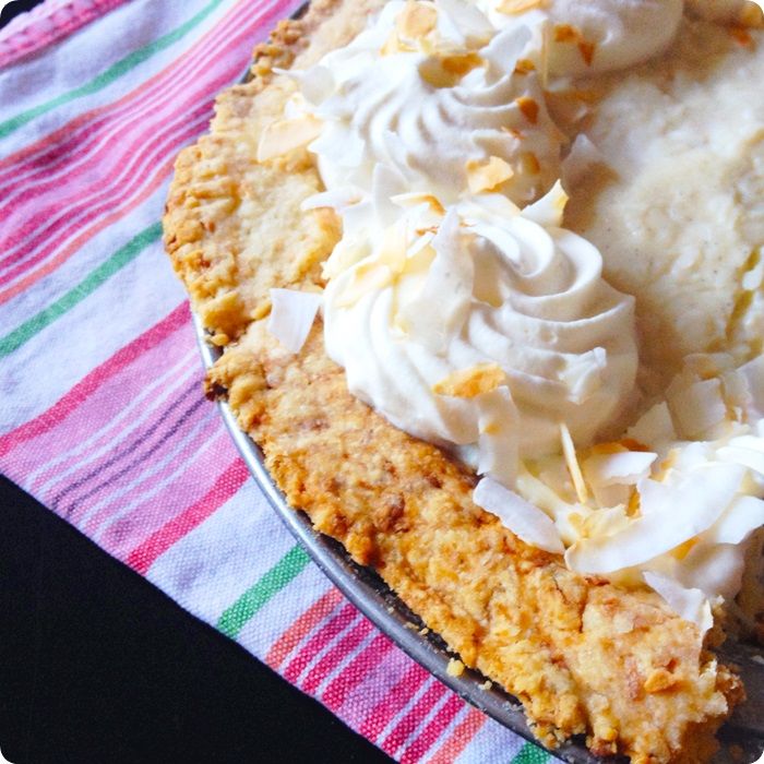It's a Triple Coconut Cream Pie. The recipe is from Tom Douglas' Seattle Kitchen. If you have the book, make it TODAY. Ok, or tomorrow. I followed his recipe to a T, no changes with the exception of omitting the white chocolate garnish.