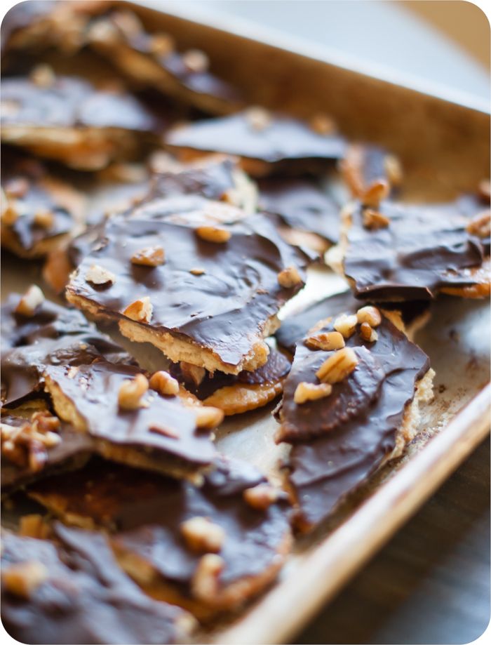 Pour the butter mixture slowly over the crackers as evenly as possible. Use an offset spatula to smooth. Again, this will not be perfect, and there will be some areas of the crackers that are uncovered.